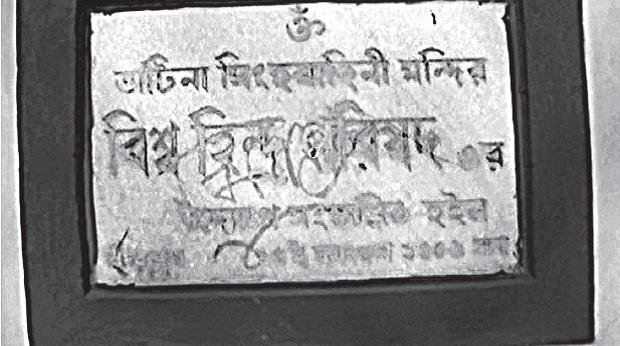 সিংহবাহিনী মন্দিরে বিশ্ব হিন্দু পরিষদের নামফলক